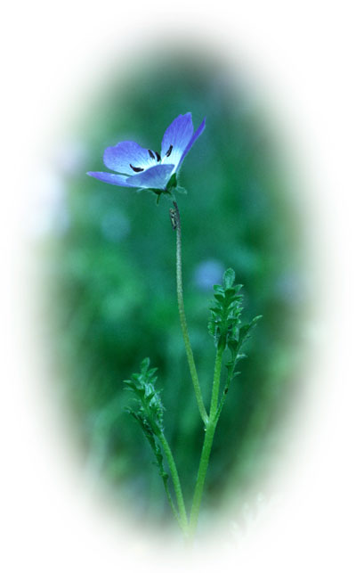 Native to the state of California and southern Oregon, the Baby Blue Eyes (Nemophila menziesii) belongs to the Hydrophyllaceae, or "Waterleaf" family, whose prime characteristic is its great affinity for water. In fact, the humidity of the soil is an important factor to the growth of this specimen. This plant's affinity to the water element is passed to the individual through the flower essence. The Baby Blue Eyes seems to mine the water deeply hidden in the individual's soul, helping the soul to encounter and heal its innate sensitivity.