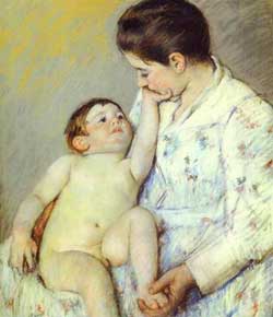 Mariposa Lily addresses issues of being held; parental and especially maternal healing and nurturing; mother-love. In thinking about the soul archetype of Mary Cassatt (1844-1926), I was struck by her uses of the maternal in her paintings. She is known for her depictions of women and children. (She began painting this subject matter only after the death of her mother.) Ms. Cassatt had no children of her own and she witnessed the losses of her siblings to early deaths. Her mother's grief over these loses in particular, was a strong influence on her subject matter and her inner life. She was close to her siblings and used them, and her nieces and nephews, as models for her work. She was constantly working on her relationship to the universal themes of mothering by painting intimate, affectionate and casual poses, that have a core feeling of wistful yearning. She shows this by the positioning of her female subjects in the majority of her best known art works. Simple domestic activities such as apple picking, bathing, a family reading, bedtime rituals or just women sitting quietly, dominate these works. The gestures of women's hands and young children being held in passive posses permeate the themes of her work. There is a far-away longing in the eyes of many of her subjects as they gaze into the distance. I believe her work was healing for her initially, then was also instrumental in the larger societal healing with regards to the positive role of motherhood, the Suffrage Movement (of which she was an ardent supporter and participant) and expressing the vulnerability and tenderness of childhood. Her own childhood was shadowed by her siblings deaths. Some of the first influences of her artistic life were painters from the Italian Renaissance who created Madonna and baby Jesus compositions. The painter Degas once said of one of her typical maternal works, "It has all your qualities and all your faults. It is baby Jesus and his English Nanny." (Reine Lefabvre— Holding a Nude Baby) She did not always have the support of her peers, but she proceeded to paint what she wanted.