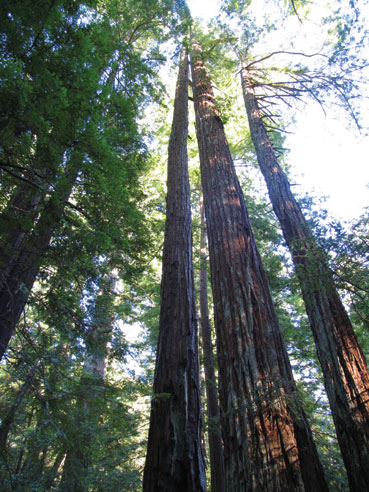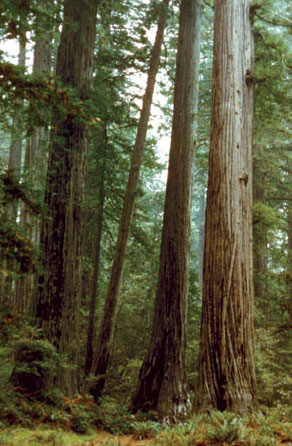Redwoods are also known for their longevity, typically 500 – 1000 years, but sometimes more than 2000 years. Our contemporary Redwoods, however, are descendents from an even more ancient lineage. A hundred million years ago, in the age of dinosaurs, the primordial Redwoods were predominant in the forests of a much more moist and tropical North America. As the climate became drier and colder, the Redwoods retreated to a narrow strip along the Pacific coast of Northern California, where summer fog and mild winters contrast with harsher inland climates.