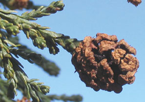The greenish female flowers, the embryonic cones, appear only at the ends of the far upper branches of the tree.