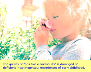 The quality of “positive vulnerability”—of being able to receive and trust a father or similar masculine presence who provides protection, strength and guidance—is a quality that is sadly damaged, distorted or otherwise deficient in so many familial and cultural experiences of childhood and youth. It is a wound that harms not only our social capacities, but also our spiritual ability to trust in higher guidance and protection (connection with the Heavenly Father). The Baby Blue Eyes type who carries this wound attempts over time to cover such vulnerability with a falsely hardened exterior that can present as emotional distancing, cynicism, lack of social trust or connection, generalized resentment or hostility, or spiritual alienation.