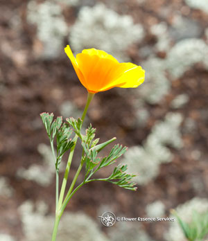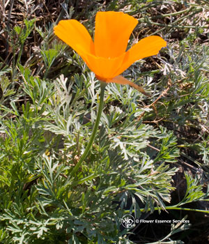 Long before the Europeans came to the New World, the Native American peoples used various preparations of the California Poppy plant for toothaches, to relieve headaches and stomach aches, and as a sleep aid for children. California Poppy tincture is currently used as mild sedative and analgesic, and also as an anxiolytic (anti-anxiety remedy). Unlike its distant cousin Papaver somniferum, the opium poppy, California Poppy contains no opiates, and is non-addictive and safe. It derives its sedative qualities from other alkaloids, and is useful in dealing with many forms of pain and anxiety, including difficulty sleeping. The tincture is very bitter, a taste little appreciated in the Standard American Diet (SAD), but quite stimulating to the digestive and immune systems. Understanding the healing gesture of essence: The California Poppy is truly a plant of the sun, opening and closing in response to the radiance of the light and flourishing in open, sunny meadows. The feather-like airy foliage, fiery colors that penetrate even into the leaves and strong seeding process are also indicative of its strong air and fire identity. The archetypal form and gesture of this flower involves the polarity of inner containment and outer movement. The expressive, mobile elements of fire and air which so prominently characterize the California Poppy, are also anchored in its luminous golden chalice.