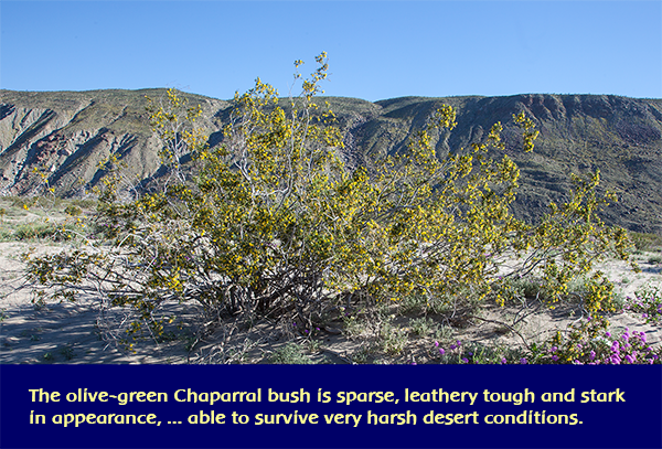 Chaparral: An Enduring Plant of the Lower Desert Chaparral (Larrea tridentata) is an evergreen native shrub, predominating in the lower desert regions of the Mojave, Sonoran and Chihuahuan deserts in the Southwestern and Western USA. It is also known as Creosote Bush or Greasewood, referring to its impressive resinous leaves and flowers. The olive-green Chaparral bush is sparse, with leathery tough features, and stark in appearance. It grows up to 10 ft (3 m) tall, able to survive very harsh desert conditions. The impressive and penetrating aroma of creosote emanating from Chaparral is often likened to the smell of rain. Its sun-like yellow flowers appear in spring, characterized by five petals and sepals and 10 stamens, producing a five-fold seed capsule.