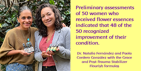 Paola Cordero González, the main coordinator for flower essence therapy pilot program, describes the typical client who come to the center, as being in an extreme state of terror and shock. These women and their children are victims of domestic abuse and violence, including rape or attempted murder. Other clients have been subjected to human trafficking and sexual enslavement. Post-Trauma Stabilizer and Grace are the two formulas Paola recommends widely for foundational recovery and stabilization for both the women and children. Post-Trauma Stabilizer eases deep-seated paralysis and accompanying loss of basic emotional functions. On the other hand, the Grace formula works on the profound impact of abuse and degradation within the feminine identity. For the children, Grace addresses the trauma and rupture of familial bonds, especially the nurturing and protective qualities of mothering, as well as sexual abuse and related violations of dignity, innocence and safety. Paola observes that after several weeks of using the Post-Trauma Stabilizer and/or Grace formulas, the women are much more able to express their emotions and acknowledge the impact of the violence they have experienced. Both the women and children experience fewer debilitating nightmares, can sleep better and have less over-all anxiety. She also notes that other counseling work is more effective because the soul identity becomes freer; her clients can access and begin to describe the many emotional fears and harrowing events that have crippled or distorted their core sense of integrity and dignity.