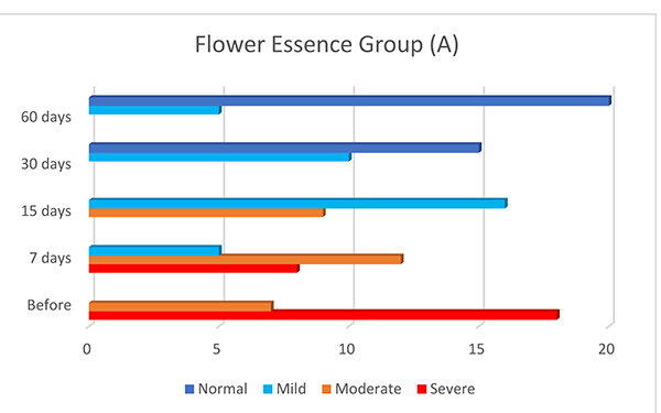 However, the improvement of the flower essence group (A) was significantly greater than that of the pharmaceutical group (B), with 80% of Group A testing “normal” at the end of the study, and considered “cured,” compared to only 40% of Group B