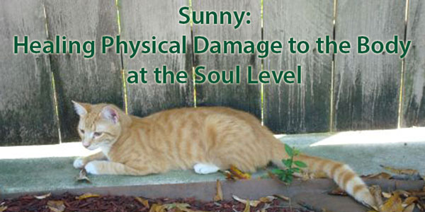 Sunny, now approximately 2½ years old, was adopted by TL as a kitten with his 6 siblings as a rescue from the street. Sunny’s health prior to his illness was excellent. When first seen, Sunny’s coat and skin were normal. He was unable to sit, stand or walk, and was barely able to hold his head up. He had just come out of a 3 ½ week coma, and was lying in a baby bed wearing diapers. At that time he was unable to interact with the other cats in his household, but seemed to be aware of their presence and that of TL (and practitioner). He made no vocalizations - and no purring. He has hissed at TL when she attempted to give him physical therapy (so that his muscles wouldn’t deteriorate from non-use). Telepathic communication indicated that he was debating whether or not to transition from the physical. He was being fed kitten milk and canned cat food thinned with water by dropper. He was sleeping 95% of the time, but was awake and somewhat alert while the practitioner was present.