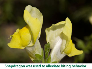 Biting behavior alleviated with Snapdragon flower essence TL indicated that Sunny was biting her on a frequent basis. Snapdragon was then added to the combination remedy as a temporary measure and the third remedy combination then consisted of Arnica , Dogwood , L ady's Slipper , Penstemon , Self-Heal , Star of Bethlehem and Snapdragon . The biting phase lasted for a little over a month at the end of which the Snapdragon was eliminated from the remedy combination.