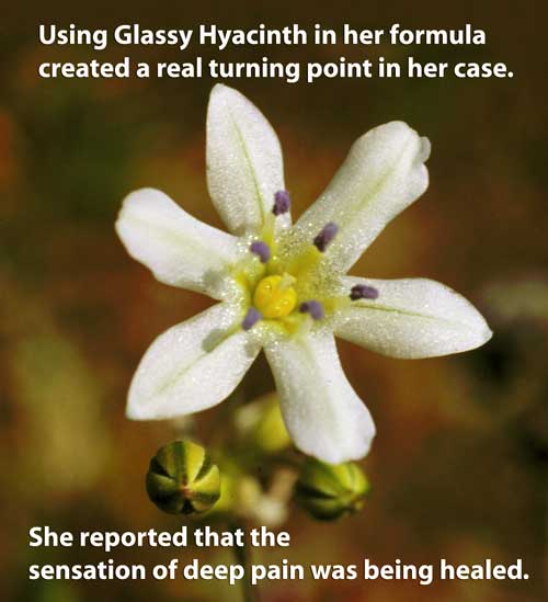About three years ago, she became pregnant again and had to stop using the pharmaceutical drugs. My client had a very difficult pregnancy with many suicidal thoughts. Her medical doctors were concerned about the baby's health. The medical team made the decision to deliver her baby by Cesarean section. During the birth process, the doctors saw clearly that her child was born with Down Syndrome. With no forethought or tact, they announced this news right in the delivery room. My client was extremely shocked by this news. It was so traumatic for her that she could not regain equilibrium. She entered a state of deep depression again. This episode was much more intense because she now had to grapple with all the special care and circumstances her new baby would need. A medical nurse by profession, my client was unable to forgive the doctors for the insensitive manner in which they gave the news, during the most vulnerable point of her delivery. She originally came to me because she hoped to reduce her pharmaceutical medications for depression. All she wanted to do was to sleep and cry. From an emotional level, I noted the profound feeling of anger inside her, which registered even at the spiritual level as a resentment against God for her fate. Her flower essence therapy included a number of key remedies, including Love-Lies-Bleeding , Holly , Willow , Star of Bethlehem and Agrimony , along with time for counseling. She improved during her initial therapy and was able to reduce the dosage of some of the pharmaceutical medicines for depression. She became more alert and responsive to her baby daughter and her special needs. Nevertheless, she experienced setbacks and her healing was still not at the deepest level. Using radiesthesia testing, I discovered that Glassy Hyacinth was strongly indicated. This gave me the insight that her pain from the original trauma was still quite deep. We talked about this and the healing qualities of this flower remedy. She described a scar at the surface of her soul, but inside she still experienced an open wound that exuded much pain.