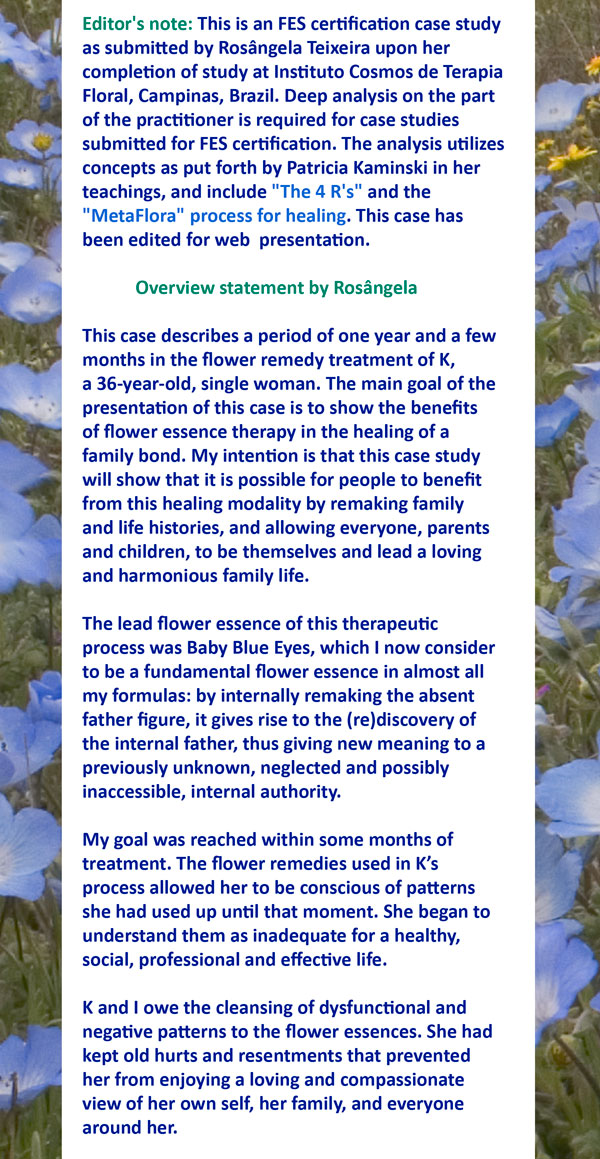 The healing process begets healing the bond with her mother K is still in therapy today. Our meetings that occurred initially every fifteen days, are now monthly, because her job is too far from my office, and also because she bought her own apartment, which affected her finances. She is working as a lawyer, her great dream when she started therapy and in order to do that, she had to abandon her old job. Baby Blue Eyes allied to the other flower essence remedies was the basis for the re-generation of her father figure and provided her the necessary structure to fulfill two of her main goals: the purchase of an apartment and professional growth. Baby Blue Eyes, amazingly and quickly, made it possible for her to accomplish a great deal towards awareness, to the point in which it was no longer possible for her to judge, in an irresponsible way, her father or any other person. When she recognized him as a “great fighter,” she recognized the great hardworking man he was. She identified and accepted his mistakes. She understood that there was a marriage without love between him and her mother, and that it would be their great responsibility and mission not allowing that this way of “loving” extend to their children. At this moment in therapy, I felt K was relieved, as if a huge burden had left her. She began to accept the family dynamics in which she had been inserted, no longer demanding from her father all the love she hadn’t received. All of this brought her the certainty that everyone lost. But Baby Blue Eyes allowed her to forgive her father: “What I feel now is that we need to go on.”