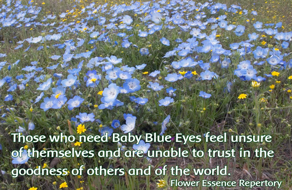 Scarlet Pimpernel – this flower essence remedy was chosen to help Baby Blue Eyes and Sunflower’s work; it facilitates the internalization of a loving father, bringing him to bear on relationship problems involving inadequate partner choices, difficulty in loving and/or shutting out people with whom she was emotionally attached.