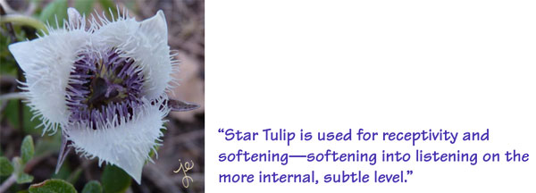 FES: What flower essences would you recommend for those who resist this kind of more engaged process, or have anxiety or other forms of resistance? JE: Actually, Rock Water would be #1. When someone is coming for flower essences for the first time, the very first thing I do is an introductory session, an educational session. I explain, ‘This is how I work with the flower essences…’ It gives them a chance to feel if there’s a connection between us and between what I’m presenting. As we enter the session, I say, ‘Use this time to get a sense in your body if what I’m offering is moving you or not— because if it isn’t, we’re not a match.’ I educate them on a slower process, about deepening, about the 4 Stages , and how it will require their regular presence. If they say, ‘Yes, I want to go forward,’ then in the first session, I’m listening to discern and feel if they are ready for a personal blend, or if it would be better to begin with a pre-made formula. When someone is new to flower essences, sometimes starting with a premade blend gives them a very tangible first experience with the flowers. They are able to feel an immediate relief of symptoms. The gradual and personal transformational process with a personal formula Their experience with a premade formula opens them to something deeper, and I’m able to say to them, ‘Wonderful! You had that experience, and now you know they are effective.’ I help them understand—and that may mean repeating it often—that when they receive a personalized blend for a longer period of time, it’s a different sort of process. It’s a different intention, a deeper, slower, more gradual, transformational process. Whereas, the pre-made formulas are perfect when we need immediate relief from acute symptoms. One dose of a premade formula may be enough to bring relief. Therefore, the pre-made formulas are oftentimes a really beautiful introduction to the flower essences. When clients are ready to enter relationship with their first personalized blend, the two flowers that I feel are very key and supportive, are Rock Water and Star Tulip . Rock Water is for softening and receptivity—the yielding qualities. Star Tulip feels like it has some of the same qualities, such as receptivity and softening—softening into listening on the more internal, subtle level. They might receive just those two essences for four full months. In that time, with the regular support sessions, I help them track what’s happening in their dream life, in their body sensations, and with what is coming into their awareness. It’s a time to teach people how to make those deeper connections to the essences they are in relationship with.
