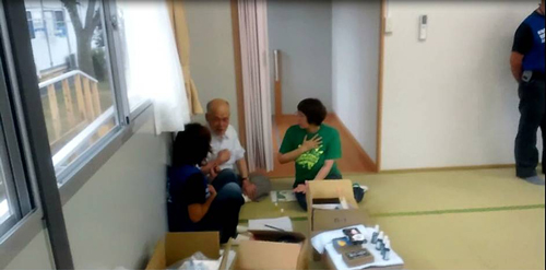 . Because the session took place in the afternoon, a large number of people—about 30—came, and the small meeting place was packed with people. Many of the residents did not know each other before coming to this temporary housing. They seemed to have moved here from many different places. Because the area near the back of the room was regarded as being more “honorable and important” to them, many people modestly huddled together close to the entrance. This time, about half of the participants were men, because many husband and wife couples came to the afternoon session. Members of the volunteer staff escorted them, and the men started sitting near the front. Most residents of this temporary housing were middle-aged and older, and because they did not know each other very well, they rarely chatted with other people who were sitting close to them.
