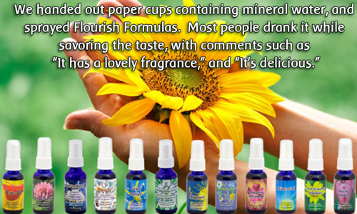 On the second page, they were asked, in a multiple-choice question format, about the emotions they wanted to heal psychologically. They were encouraged to write in free comments with as much detail as possible. Based on these answers, we selected their favorite FloraFusions skin oil and Flourish formulas, and gave them to take home as well. We handed out paper cups containing mineral water, and sprayed Flourish formulas. Most people drank it while savoring the taste, with comments such as “It has a lovely fragrance,” and “It’s delicious.” I remembered many participants in the morning session responding similarly to the taste and fragrance. Up to that point, I have had many people drink flower essences at seminars and other events. However, this was the first time that everyone readily responded to the taste and aroma of the fragrances without an ounce of doubt. I’m sure there were those who could not feel any taste or aroma. However, since they all tasted flower essences with delicate sensibilities, I felt that they might have perceived the changes that had occurred. On the questionnaires, most people answered “Normal” to the question about their physical conditions. None of them answered that it was good. Parts of the body in which they felt pain and other discomforts included those caused by injury or chronic illness, as well as stiffness, chills and itchiness. Most people said that they had stiffness somewhere in their bodies. As for sleep, about half of them said that they occasionally could not sleep soundly, and the remaining half said that they could sleep well. For those whose answers caused us concern, we advised them to go see a doctor.