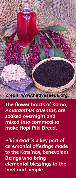 The leaves and seeds were mixed with honey or agave and consumed or otherwise offered ritualistically in honor of Xiuhtecuhtli, a fire god. In the Hopi tribe, the red color of the “komo” Amaranth was used to make “piki” wafers. These wafer-like breads were eaten ceremonially to invoke the Katsinas, the benevolent beings who dwell in mountain springs and lakes and bring elemental blessings.