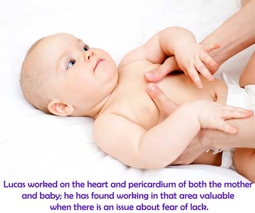 During the first session, Lucas worked on the baby; he worked on her cranium, skull, liver, and pelvic areas. It appeared that the baby didn’t feel serene or secure. Lucas wondered if the mother also didn’t feel secure in her role as a mother. He thought it would be valuable to work on mother and child bonding. He gave the mother Mariposa Lily , Star of Bethlehem , and Chicory in a crème to be used on the breast and thorax areas. During the second session, the mother told Lucas that she had had to stop breast feeding the baby because the baby was not gaining weight, and therefore she had to use a bottle to feed her. The baby had also been given medication for spitting up. Lucas had asked them to come for a session together; he worked with both of them at the same time. He had a suspicion that there could be some kind of reciprocal fear between the mother and child. Lucas used Red Chestnut in crème for both of them on their right hands, as indicated for Red Chestnut in the book written by Dietmar Krämer. The Red Chestnut was indicated to help the mother to feel confident that the baby’s crying would stop, and to be confident with the baby in their closeness together, creating a secure space between the baby and the mother. Lucas also worked on the baby in its thorax area. For the mother, Lucas next used Chicory and Pine because he sensed that she felt responsible for the relationship between her and the baby, the baby’s crying, and that she had done something wrong to cause it. The two essences were used to clear that feeling and become confident that the baby would come back to a calm space. It was not the mother’s fault, it was just situational. Lucas worked on the heart and pericardium of both the mother and baby; he has found working in that area valuable when there is an issue about fear of lack. The mother was very tense in the upper part of her body, but then she relaxed at that time—and the baby also stopped crying. Lucas left them together for about ten minutes, as he could see that something was happening between them; they were now very close, and bonding. She reported she felt more conscious of the space between her and the baby, the common space between them. Lastly, Lucas used Crab Apple topically on the mother. The Crab Apple was used to help clear what had happened between the mother and baby, something that should not have been, the loss of their relationship. She said while he was applying it, she felt warmth in the thorax area. Lucas asked the mother to continue to take the combination of Mariposa Lily , Star of Bethlehem , and Chicory to keep the thoracic space open and maintain that sensation of warmth.