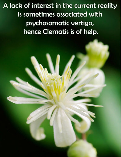 Psychosomatic vertigo healed after establishing renewed interest in life An elderly man age 80, came to see Lucas because he was experiencing vertigo and dizziness, which had started one year prior to seeing Lucas. Doctors could find no illness or physical cause for the occurrence, even though he had undergone every diagnostic evaluation possible. Lucas found no traumatic presenting condition. The man had had recent surgery for a herniated disc, and had a heart attack 30 years ago. He also had high blood pressure. The man had been going to bed late, and waking up late. While he loved to sleep, he also liked to be active. He further explained that his wife had hip replacement surgery 6 months prior, and he also worried about his grandchild. Lucas first used topically on his body Clematis and Impatiens to help with the tone of his body; he had high tone in the upper part. The Clematis helped to calm that down and helped to distribute tone in the body as a whole, particularly in the areas of the lower body. The intention was to help calm the mind and nervous system. Lucas then worked on the cranial base, to facilitate mobility at the base of the cranium, an area related to the internal ear. He advised the man to use a combination of Clematis (for patterns of disconnection, not being in reality), Impatiens (what Lucas thought was his personality type flower), Scleranthus (for instability), Walnut (to help readapt to the new situation with his wife who had been ill, and for the situation with the grandson). Three weeks later, everything was getting better and the man only experienced dizziness at 7 pm every night just before going to eat dinner. But also, he had new pain on the lateral side of his elbow, the Kramer zone for Wild Rose . So topically, Lucas used Clematis and Wild Rose , the main remedy for that session. Lucas helped him to unlock all the body parts and regulate the tone of all parts of the body that could cause disharmony. He then worked on the general cranial, pelvis, and diaphragm to try to regulate the nervous system. He asked the man to use Wild Rose and Clematis . During the session, the man spoke of being bored. He explained that he and his wife were jewelers; she was the designer and he handcrafted the pieces. Since his wife’s hip replacement surgery, she had not been feeling creative, and so he had not been making her jewelry designs, became quite bored from the inactivity, and was just reading all day everyday. Lucas spoke with his wife who was present, and she said that she had been feeling overwhelmed and confused since her surgery and after a bad fall which hurt her back, and didn’t know where or how to start her work again. But she also said that she didn’t want to design jewelry any more, because her husband was no longer motivated. Lucas recommended Scleranthus and Elm to help her find a new way to begin, and to clear her mind of confusion. And, because she also had pain everywhere in her body, was tired and tense, he recommended Star of Bethlehem and Olive to help with the trauma of the surgery and the fall. A month later, the man returned to see Lucas and his vertigo was gone. However, he had low back pain, in the area where he had had surgery, and pain in his right shoulder and neck. Lucas treated him in those areas and also used topically Pine on the shoulder. He also used Vervain and Dandelion Dynamo oil. He worked on the shoulder, pelvis and liver, too. All of this helped to clear up everything. An equilibrium was established finally between the man and his wife, so that once again, she was designing jewelry which he then created. Lucas has found that a lack of interest in the current reality is sometimes associated with psychosomatic vertigo, hence Clematis is of help.