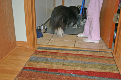 We took Maize along with our other three dogs (also Shelties) on a weekend trip to our cabin in Wisconsin. I was anxious to observe her behavior in the new surroundings. I was surprised that she seemed to be more social and very comfortable in a smaller space (the house is quite a bit smaller than our other house). As I was concerned about her reaction to her new space, and the amount of snow built up along the fence, we attached a long cable to her collar so Maize couldn’t climb over the fence to escape. She didn’t want to “potty” while attached to the cable, but did thoroughly enjoy taking walks in the snow with the other dogs.