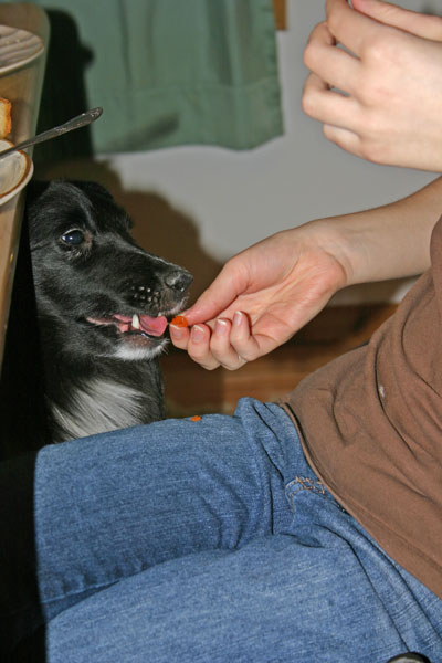 I noticed that Maize doesn’t sleep huddled in the corner of my daughter’s bed anymore. She feels comfortable enough to sleep in the middle of the bed. She has also started to take chicken from our hands, which she would NEVER have done previously. We have been taking her to dog training classes, where, to my surprise, she has been able to maintain her composure. She will also take treats at training.