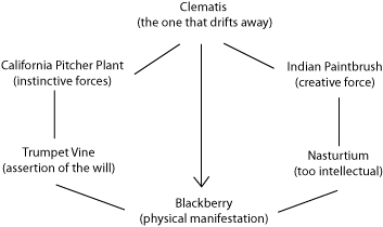 I wanted to soften his intellectual tendencies and his being prone to live in the mind and/or other worlds ( Nasturtium , Clematis ), and yet promote his getting in touch with creative and instinctive-bound procreative forces ( Indian Paintbrush , Trumpet Vine , California Pitcher Plant ) so that he could fully manifest in the world ( Blackberry ).