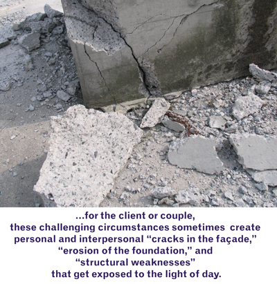 On the surface, the client’s issues concern the obvious: money, time, and structural issues that cannot be anticipated until the scope of the renovation is fully exposed. On another level, for the client or couple, these challenging circumstances sometimes create personal and interpersonal “cracks in the façade,” “erosion of the foundation,” and “structural weaknesses” that get exposed to the light of day.