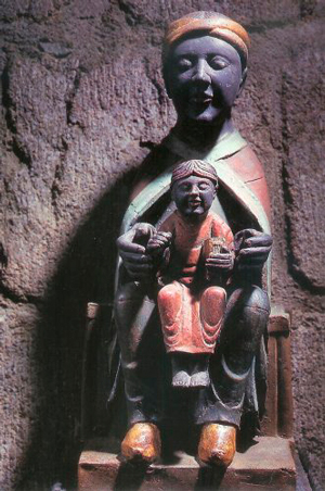 The majority of Black Madonna statues were created in the Middle Ages. They fall into three major types. iii The first is the Byzantine icon style, produced in Italy in the thirteenth and fourteenth centuries. The second and third types are wooden statues typically around thirty inches tall. The oldest are the enthroned or “seat of wisdom” madonnas of the eleventh and twelfth centuries, found primarily in south-central France and known as Vierges Noires. Their facial expression is one of power, majesty and deep interiority.