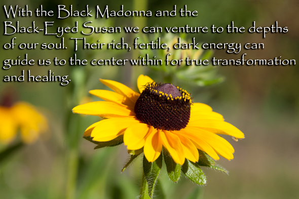 The Black Madonna archetype awakens in us a call to the darkness. She invites us into the darkness and into our depths. “Standing in the crypts of great cathedrals or upon alters of out of the way and humble churches or chapels, images of the Black Madonna are objects of intense veneration, prayer and pilgrimages that have been going on for centuries.” ix Pilgrims go to show their devotion to the Black Madonna and to honor the healing power inherent in her transforming darkness . “Blessed Black Madonna, Thou are filled with the healing energies of love, grace, and mercy. Into the depths of Thy dark mysteries I cast all of my thoughts, words and actions – my body and soul. ” x This journey is not only about traveling to a particular place, but also about a journey to the depths within, a pilgrimage to the shrine of our own inner darkness. The Black-Eyed Susan flower essence can also take us on a pilgrimage to the center of our inner darkness. Through its vibrational imprint we are able to gain more insight and self-awareness; we are able to acknowledge and work with all aspects of the self. “This energy is already organized for us and when we bring it into the healing process, we are bringing a vast intelligence into the energetic form with which we are working.” xi The Black-Eyed Susan stimulates insight into the deep burdens we carry within and guides us to their release. Likewise, material representations of the Black Madonna stimulate a recognition and resonance with this living healing archetype.