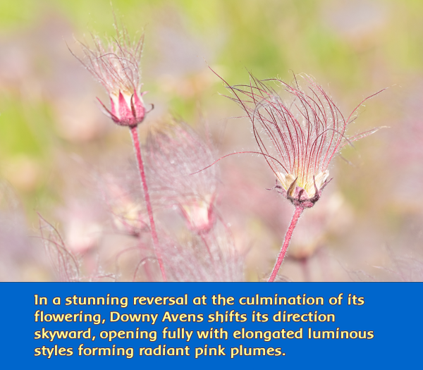 In the alchemical language of Nature, the elements of earth and water are oriented downward, connected with the interior earth pole, while the elements of air and fire rise upward aligned with celestial forces. The Downy Avens integrates these opposite forces with exceptional mastery. It initiates its growth in spring, staying close to the earth, forming a mound of fern-like leaves, gradually spreading horizontally with rhizomatous roots in moderately moist (mesic) soil. In its initial stages of growth, Downy Avens does not ascend in typical vertical fashion, but remains related for a relatively longer period of time to earthward forces. The sepals have two parts, the outer lobes as well as an inner covering. The petals, stamens and pistils are all so tightly fused that bees have to force their way in to pollinate the flowers. Then in a stunning reversal at the culmination of its flowering, it suddenly shifts its direction skyward, opening fully with elongated luminous styles forming radiant pink plumes bearing fruits called achenes. The feathery heads of the Downy Avens are endowed with light-bearing silica, intimately aligned with the weaving air and wafting sunlight.