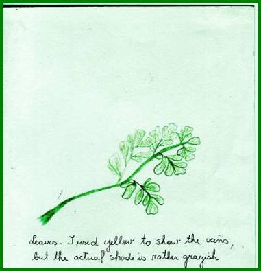 A cor das folhas de textura aveludada varia do verde-acinzentado ao verde-azulado. As pequenas folhas arredondadas estão dispostas simetricamente na parte superior do caule. São de um verde muito brilhante e claro quando jovens, tornando-se verde-acinzentadas à medida que envelhecem, até ficarem marrons nas pontas e caírem. Algumas folhas mais velhas têm uma camada branca e macia na parte inferior. Não estou segura de ser esta uma característica da planta, ou algum parasita da planta que observei. As folhas estão simetricamente distribuídas à direita, à esquerda e na ponta de cada haste individual. Cada folha tem uma nervura central acinzentada, e várias nervuras secundárias originando-se a partir desta. Algumas folhas lembram o formato de um coração.
