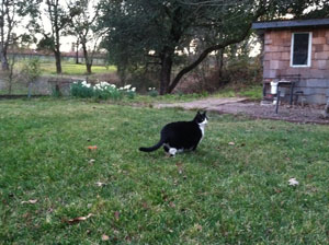 Rescued from a shelter by a loving family Nila’s primary caretaker is her owner, Genevieve, and Geni’s entire family: Jaime, Tara and Chris. She was adopted from a shelter as Geni’s own pet. The family lives together in a single home. Genevieve is now in college, and comes home often on weekends to visit family and friends and to see her beloved cat. Nila was a rescue from Trenton, New Jersey, brought home at about 6 weeks of age. She was adopted along with another kitten, Chuckie, from a different litter, who spent time in the same cage at the rescue shelter. When she came into the home, she and Chuckie shared a blanket, and had each other, as they had already bonded. Nila’s human family treats animals as if they have the exact same rights as human beings. They are vegetarians, and speak to and care for their pets like children. Nila has led a peaceful and comfortable life up until the move to California. There, she lived for one year in a small ranch house with a tiny fenced in area and deck space, then moved to a larger house without the possibility of fencing in the countryside of Sonoma County. In the beginning she was kept inside, then let onto the deck, then eventually outside during the afternoon hours, her family outside with her. Then eventually, she and Chuckie were allowed free range in the open spaces of vineyards and stable areas. A female kitten had joined the family. Nila lives with an animal family of two other cats. The open spaces are open as well to other animals, wild and domestic, such as neighborhood cats and dogs, wild animals like wildcats, wild boar, jack rabbits, coyotes, gophers, raccoons, turkeys, etc.
