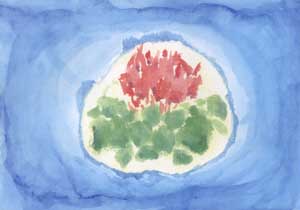 Session 2 She seemed to enjoy seeing me again after a month. She said she had never taken the same essence combination for an entire month before. However, Keiko felt very irritated and anxious during the month. She described it as her negative parts just breaking to the surface ( Agrimony and Cayenne ). What most impressed her was that she realized how tired she was. She had been sick with throat pain and was not in good condition. She had two interesting dreams in the first part of this month. One is the dream she had on the night she started taking flower essence. In the dream, she was in underground shopping center. There she had a feeling that a big earthquake would happen. Then she ran away with terror. The second dream was of finding a badly wounded cat in the space under her house porch. The cat seemed to be dying and she knew it. She wanted her to die in a comfortable space but the cat did not react to her calling. I think these dreams represent her anxiety to look into her inner self. She had been hiding her own true feelings, as though badly wounded like the cat under the porch. Going underground is also a symbol to go into unconsciousness. In a real life, she had been working with two persons with severe physical disabilities. Sometimes they were very selfish. (They also appeared in her dreams) Keiko had never complained about it. But this month, she expressed her anger to her co-worker. She did not like her co-worker’s response and became angry. Surprising to her, her co-worker did not seem to be annoyed, but rather showed sympathy to Keiko. From this exchange, she realized it's she herself who prohibits anger, because she is afraid. Keiko said "I had been affected even by my own thoughts." ( Centaury ) She said she used more time to paint or weave. She described this "it's like playing with colors. Kid's play."( Indian Paintbrush ) After realizing how easily she was affected by others, she said “I want to confront my own feelings. I do not want to run from them any more. For a long time, I had been deceiving my feelings. What I had been trying was to act natural, but now I know it's all fake…” And we discussed and agreed that she needs to be more grounded. Her drawing of a tree without roots (below) seems to be speaking its need. Keiko's dream had a lot of symbolic images and it helped me to choose the next flower essence formula— Agrimony , Centaury and Indian Paintbrush – for the same reasons as the prior session Buttercup – to find her own light; she seems to have lost confidence Corn – for grounding, to help her stand on her own two feet Angelica – for her anxiety. She seems to need angelic help in her initial process of transformation. She told me that Angelica is one of her favorite essences.